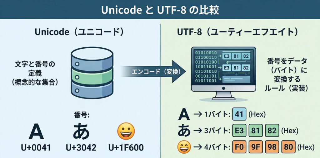 文字コードを理解する際、初心者がつまずきやすいのが「Unicode」と「UTF-8」の混同です。この2つは役割が明確に異なります。